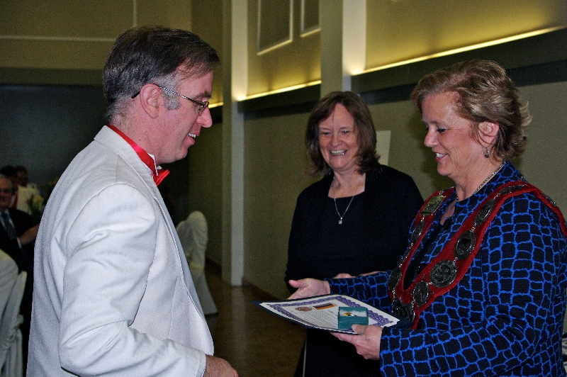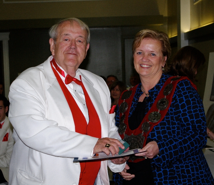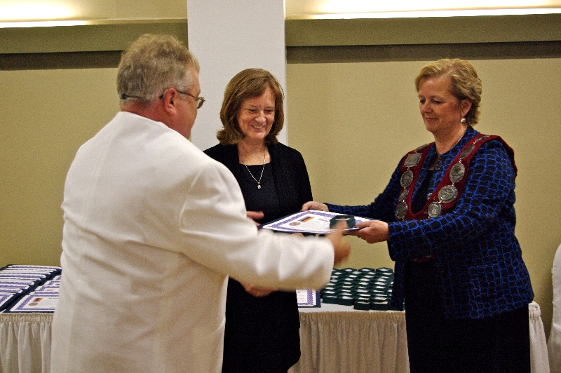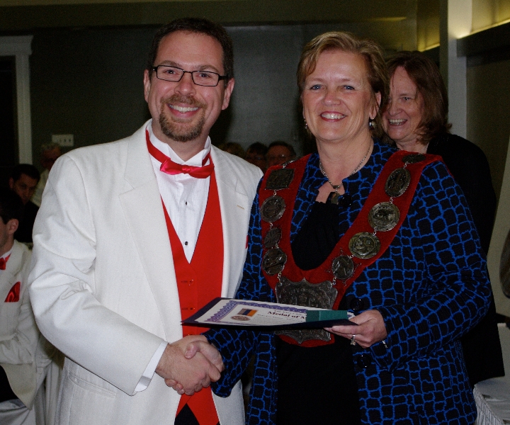 Music Director Bob Shami (L) and Chapter President Folgo DellaVedova (R) accepting 2010 Medal of Merit from Mayor Debbie Amaroso - May 7, 2011